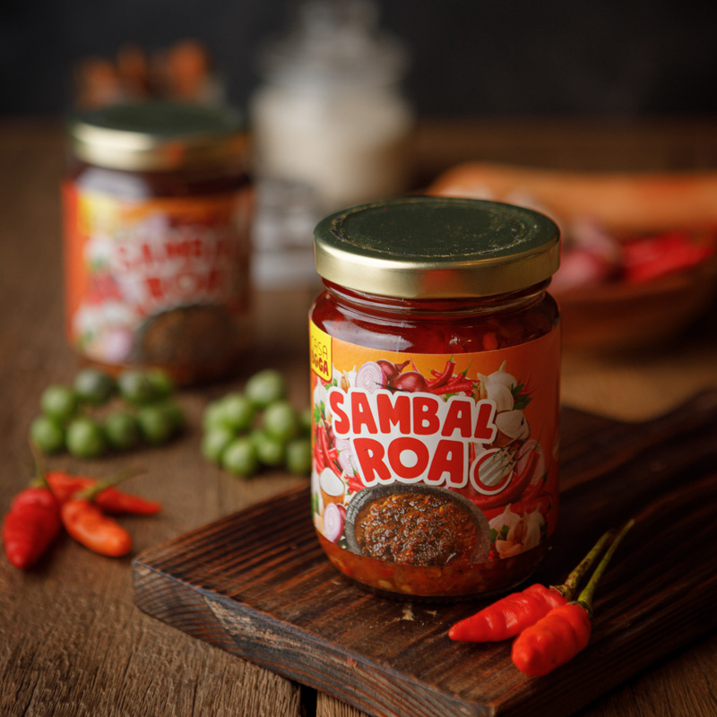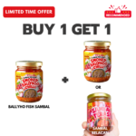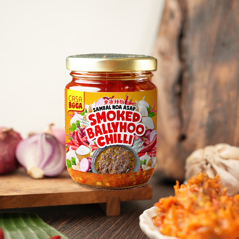 **Ballyhoo Sambal:** This sambal is made with ballyhoo fish, which is native to Manado, a beautiful city located at North Sulawesi, Indonesia; well known for its fresh produce of seafood, as well as breathtaking beaches perfect for snorkeling. The combination of our secret recipe using high quality ingredients and the unique flavor of smoked ballyhoo fish made this sambal a distinct taste unlike others. It is recommended to have them with stir fry mix veggies, long beans and unique taste to your otak-otak (otah). It is good as dips too.