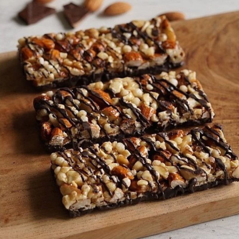 Ingredients = Dark Chocolate (22.5), Almonds, Peanuts, Honey, Rice Syrup, Rice Crispies, Rice Syrup,Cashews (5%), Sea Salt (0.2%), Soy Lecithin