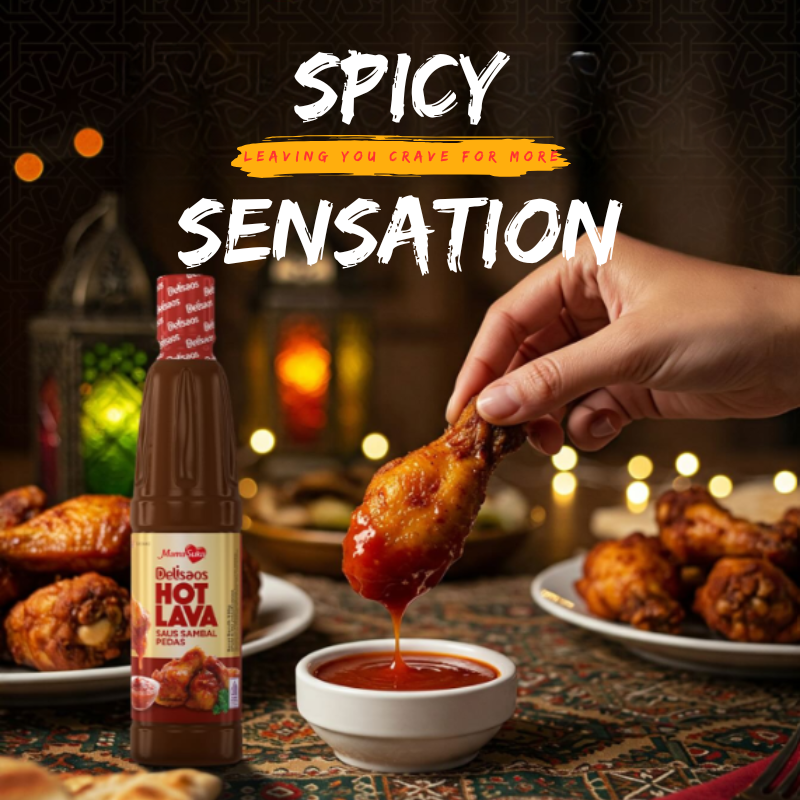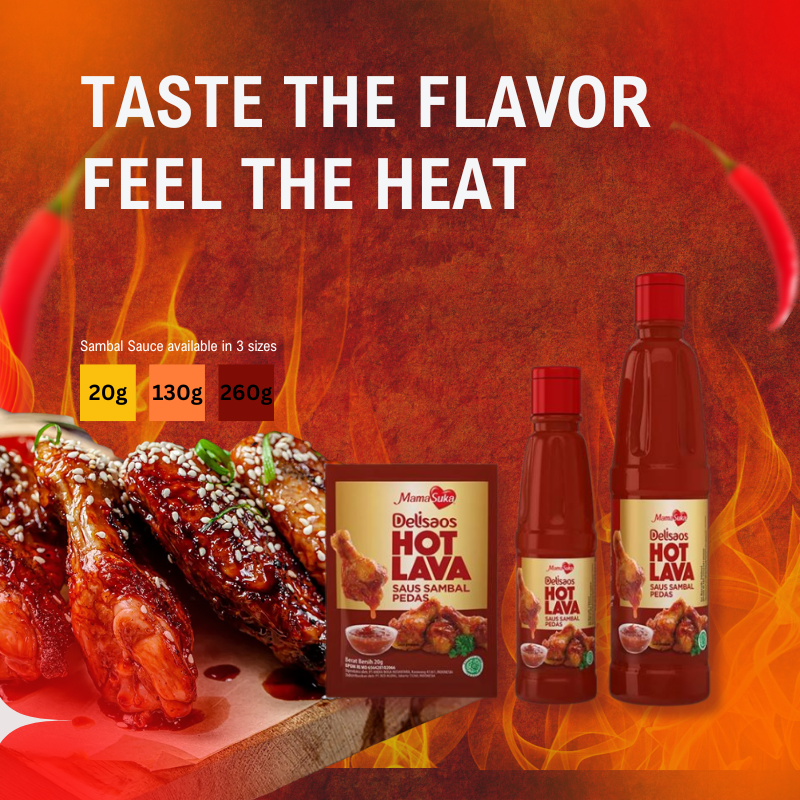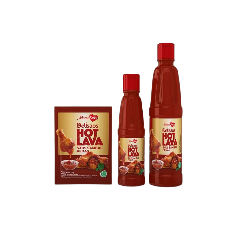Mamasuka Delisaos Hot Lava Sambal Sauce 320g is a spicy chili sauce with a unique flavor sensation from a blend of selected chilies, BBQ seasoning, garlic, black pepper, and chicken extract, resulting in an addictive savory and spicy flavor, perfect for dipping or mixing with other foods.