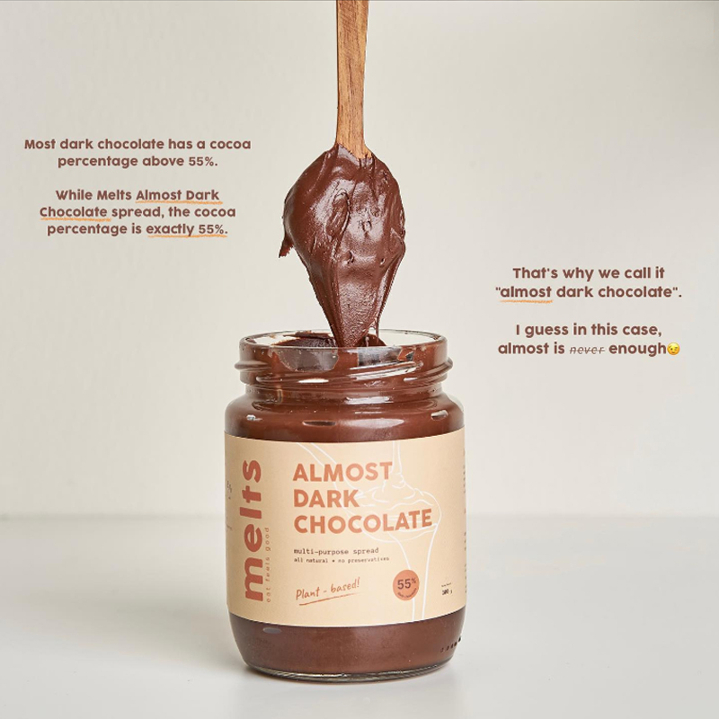 1. Melts spreads are known for being plant-based, sugar-free and halal! They are rich in taste but creamy smooth and light in texture. Making it guilt free and healthy indulgence for chocolate lovers! They are good as spread or can be a secret ingredients to many chocolate food, drinks and dessert collections.