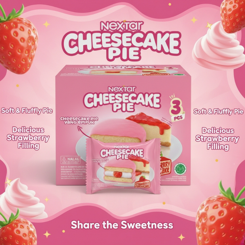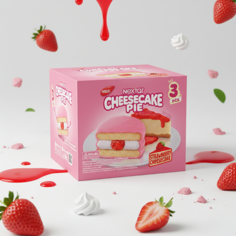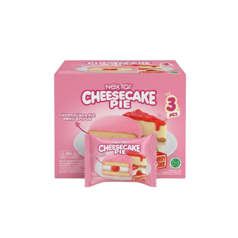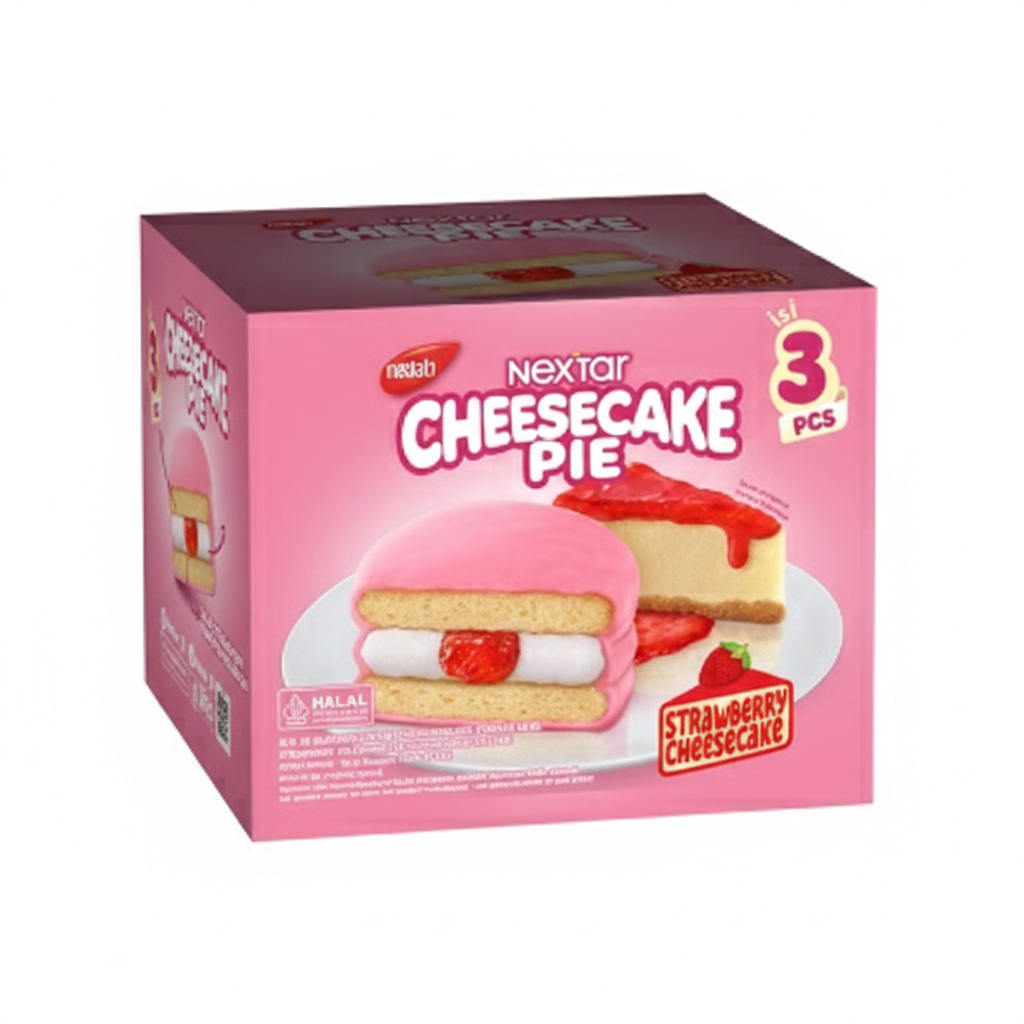 Nextar Cheesecake Pie Box (3 Pcs) is a soft, indulgent pie that takes snacking to the next level. Each piece features a tender softcake filled with smooth, sweet cream cheese and a hint of fruity flavor like strawberry, then finished with a rich chocolate coating. The result? A perfectly balanced bite that’s soft, creamy, and irresistibly satisfying.